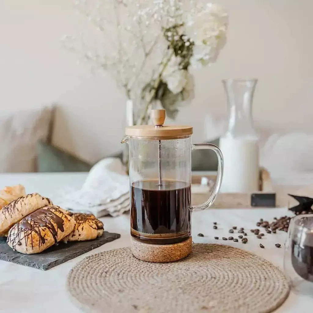 Cafetera prensa francesa con base de corcho. Precalienta tu cafetera llenándola con agua caliente y déjala reposar durante 1 minuto. Añade una cucharadita de tu té o café favorito para cada persona. Añade agua casi hirviendo en la cafetera hasta un máximo de 2,5 cm por debajo de la parte superior del vaso y revuelve ligeramente. El agua que llega a hervir no da el mejor sabor. Coloque la tapa con el grupo de filtro completamente levantado en la parte superior del vaso y déjelo reposar durante 3 a 5 minutos. Empuje lentamente el eje central hacia abajo para que el filtro llegue suavemente al fondo del vaso de vidrio. Recuerde que el agua está a temperatura de ebullición y se debe tener cuidado de no empujar hacia abajo demasiado rápido. Para limpiar el émbolo, simplemente retire el eje central, enjuague el té o café restante y lávelo a mano con agua tibia y jabón. Enjuague con agua dulce limpia y déjelo secar en un lugar bien ventilado. No es necesario retirar la sección del vaso de vidrio durante la limpieza. Capacidad de 1000 ml.
